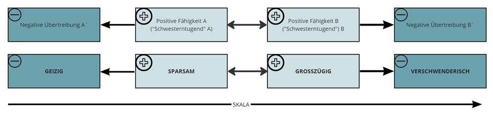 Erst in der Übertreibung werden beide Tugenden zu Untugenden. Ist einer immer sparsam, könnte es passieren, dass er in den Geiz abdriftet. Ist eine sehr großzügig kann es sein, dass sie als verschwenderisch wahrgenommen wird. Jede positive Eigenschaft wird durch ihr (ebenso positives Gegenstück) komplementiert – und durch die Übertreibung ins Negative verkehrt. Dargestellt ist diese Logik in einem Quadrat (Abb. 1), welches auch eine Skala sein könnte (Abb. 2). Klappt man die unteren Vierecke jeweils nach außen, ergibt sich ein Kontinuum.